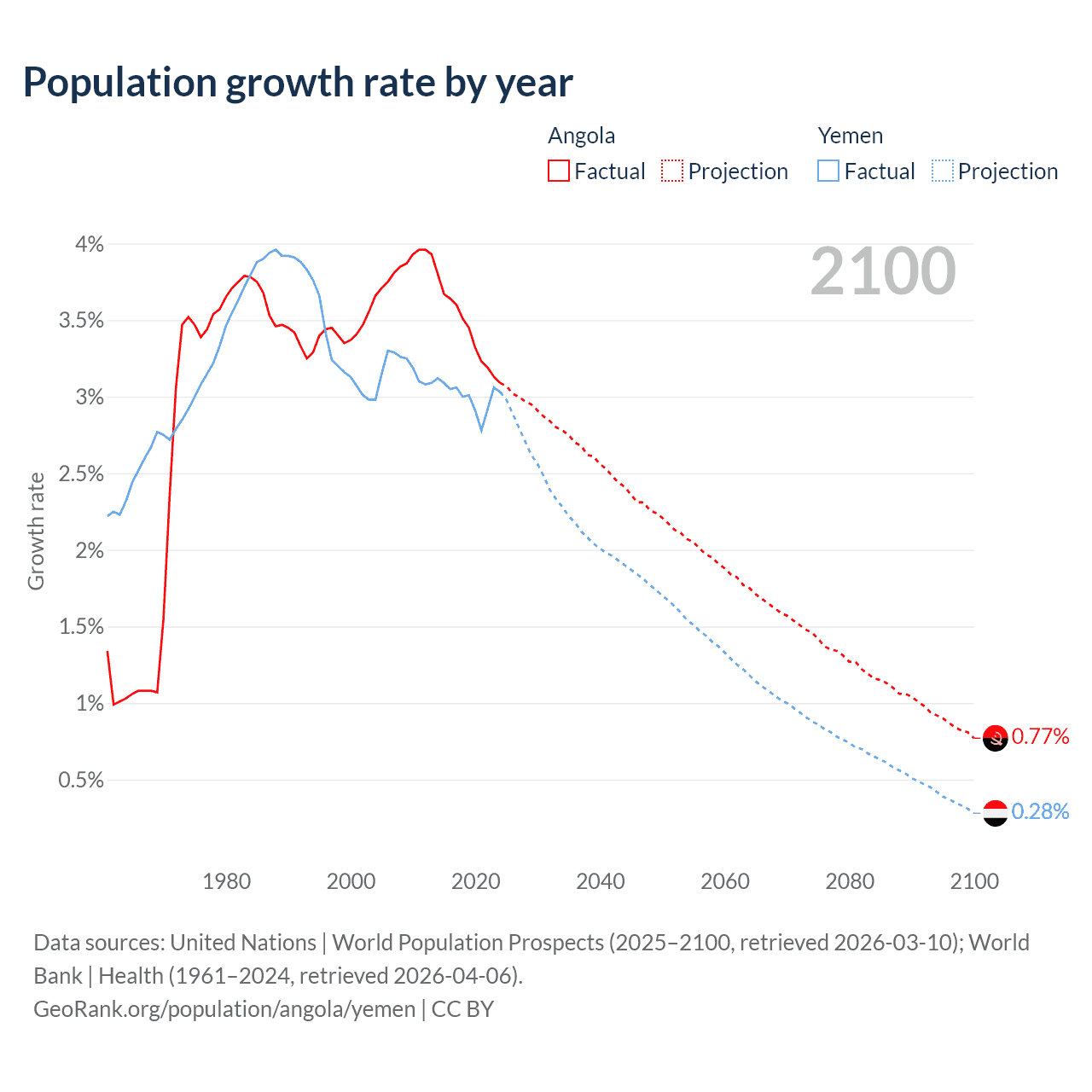 - For the last 10 years, Angola has had an average growth rate of +3.42% per year vs +3% in Yemen.