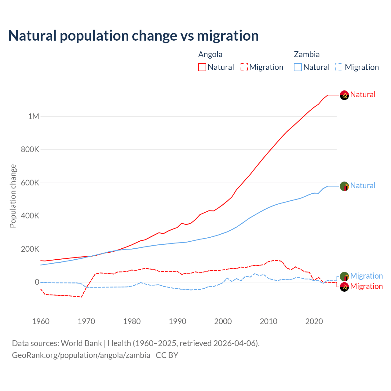 Over the last 10 years, 95.5% of the population change in Angola is from natural causes (a gain of 10,163,567 people) and 4.54% is from migration (a gain of 483,327 people). In Zambia 97.4% is from natural causes (a gain of 5,233,797 people) and 2.58% is from migration (a gain of 138,554 people).
