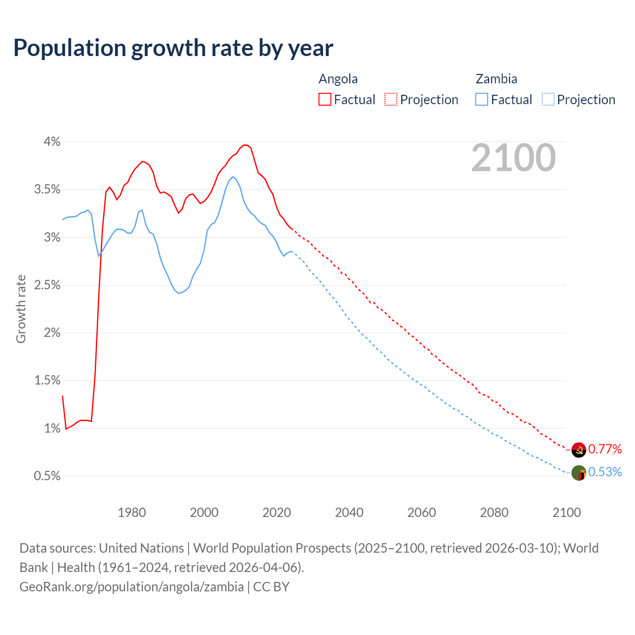 - For the last 10 years, Angola has had an average growth rate of +3.42% per year vs +3% in Zambia.