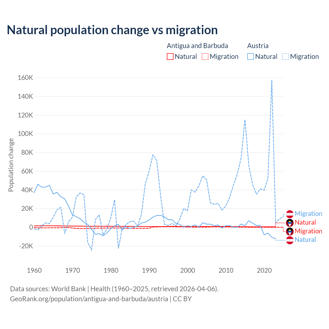 Over the last 10 years, 97.2% of the population change in Antigua and Barbuda is from natural causes (a gain of 4,971 people) and 2.76% is from migration (a gain of 141 people). In Austria 2.61% is from natural causes (a loss of 16,936 people) and 97.4% is from migration (a gain of 631,325 people).