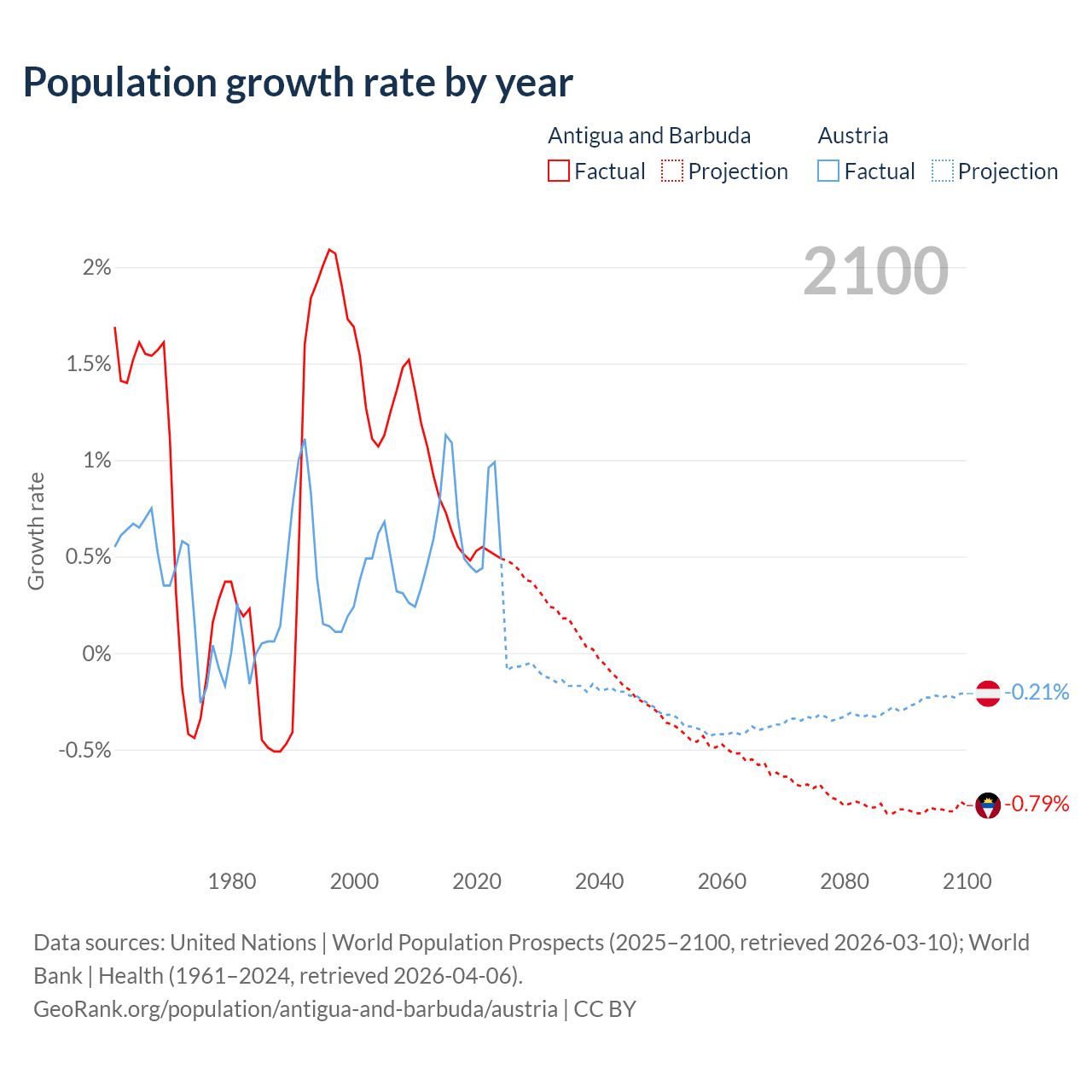 - For the last 10 years, Antigua and Barbuda has had an average growth rate of +0.57% per year vs +0.72% in Austria.
