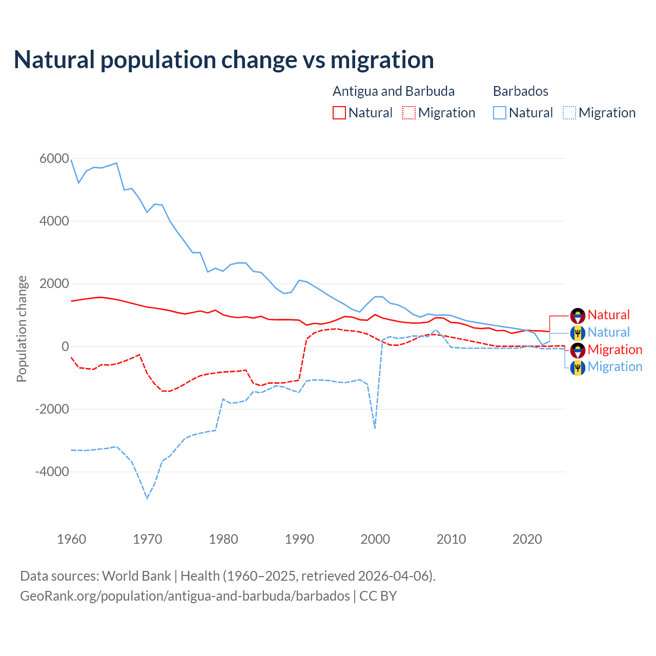 Over the last 10 years, 97.2% of the population change in Antigua and Barbuda is from natural causes (a gain of 4,971 people) and 2.76% is from migration (a gain of 141 people). In Barbados 89.5% is from natural causes (a gain of 4,936 people) and 10.5% is from migration (a loss of 578 people).