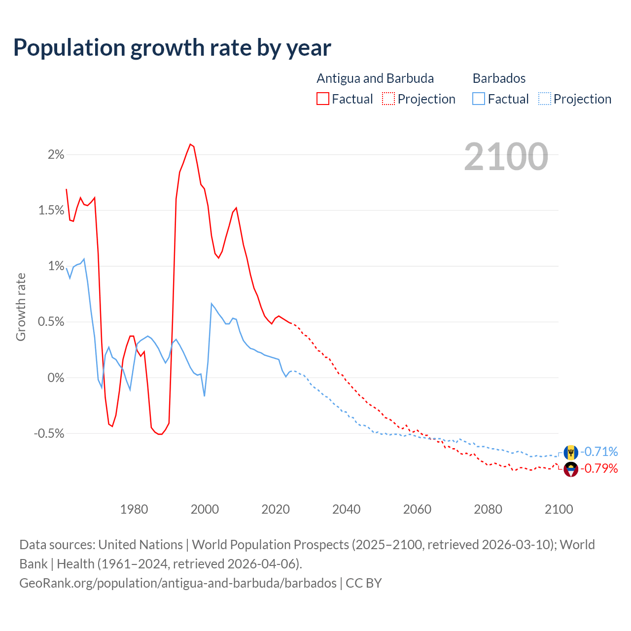 - For the last 10 years, Antigua and Barbuda has had an average growth rate of +0.57% per year vs +0.16% in Barbados.