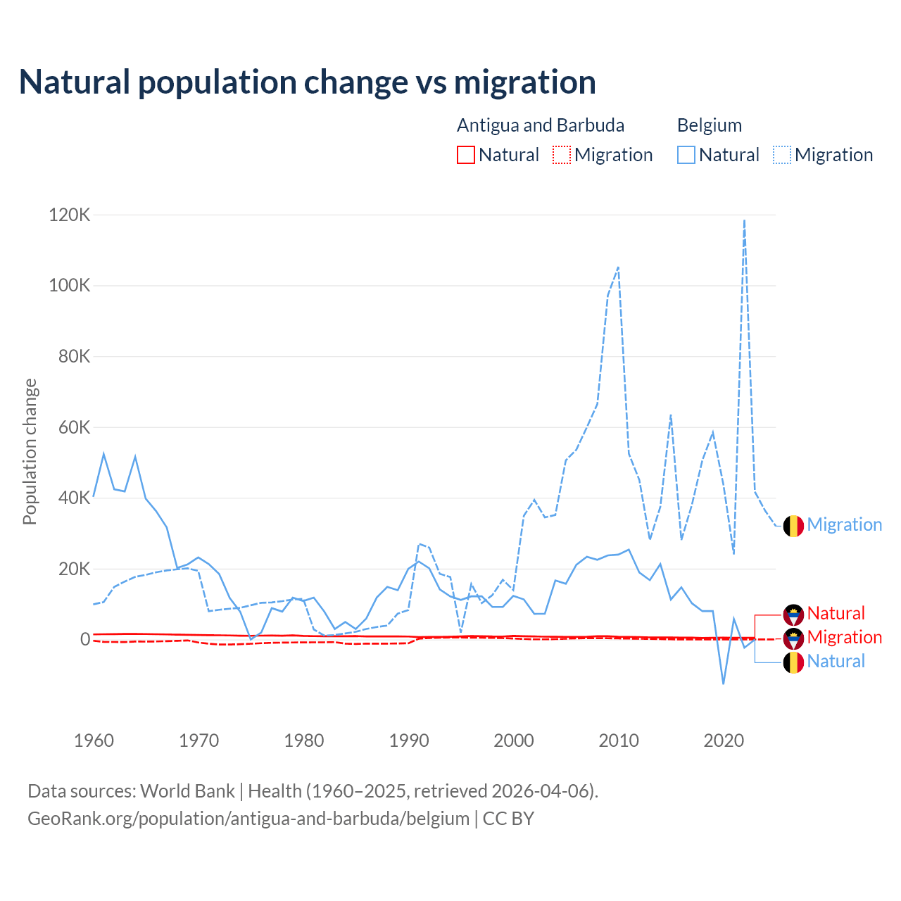 Over the last 10 years, 97.2% of the population change in Antigua and Barbuda is from natural causes (a gain of 4,971 people) and 2.76% is from migration (a gain of 141 people). In Belgium 11.3% is from natural causes (a gain of 64,346 people) and 88.7% is from migration (a gain of 504,240 people).