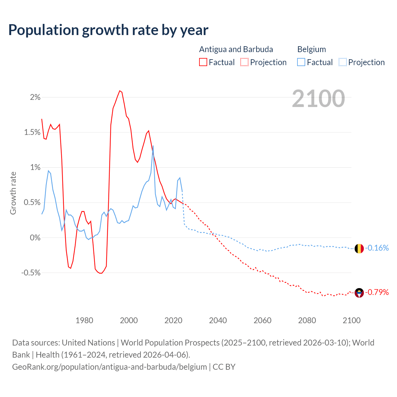 - For the last 10 years, Antigua and Barbuda has had an average growth rate of +0.57% per year vs +0.55% in Belgium.