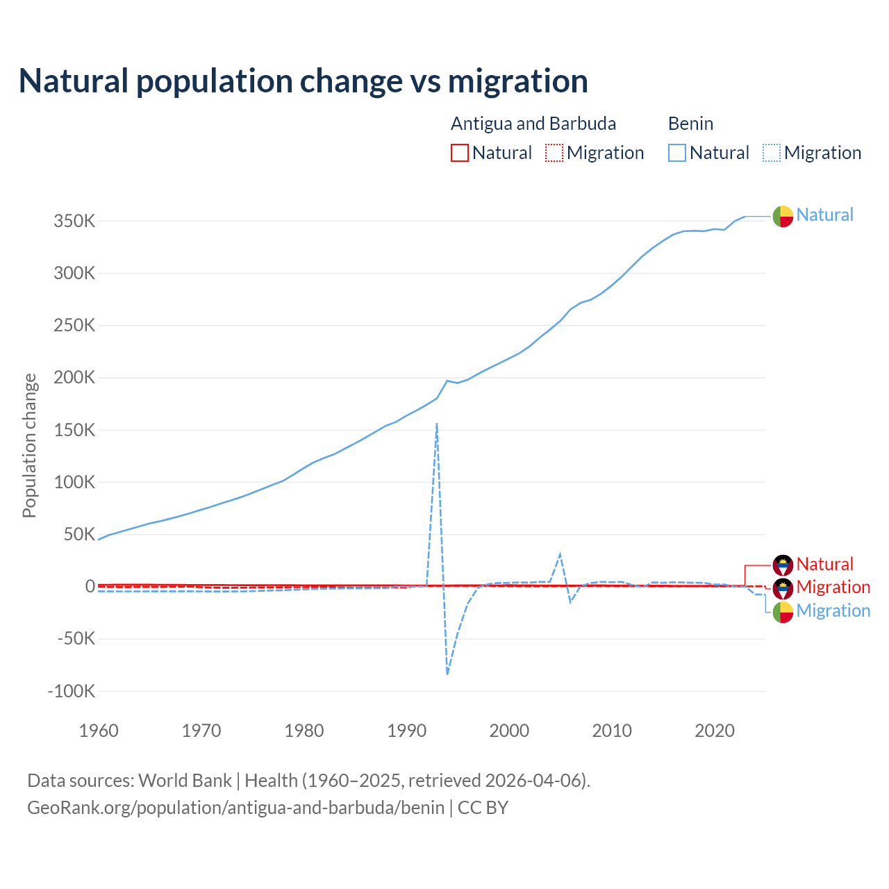 Over the last 10 years, 97.2% of the population change in Antigua and Barbuda is from natural causes (a gain of 4,971 people) and 2.76% is from migration (a gain of 141 people). In Benin 99.3% is from natural causes (a gain of 3,397,218 people) and 0.71% is from migration (a gain of 24,401 people).