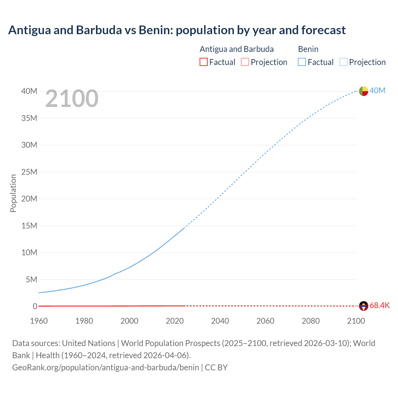 The latest officially reported population of Antigua and Barbuda was 93,772 in 2024 vs 14,462,724 people in Benin in 2024. In 2026, based on the adjusted UN estimation, the current Antigua and Barbuda's population is 94,757 people compared to 15,272,847 in Benin.