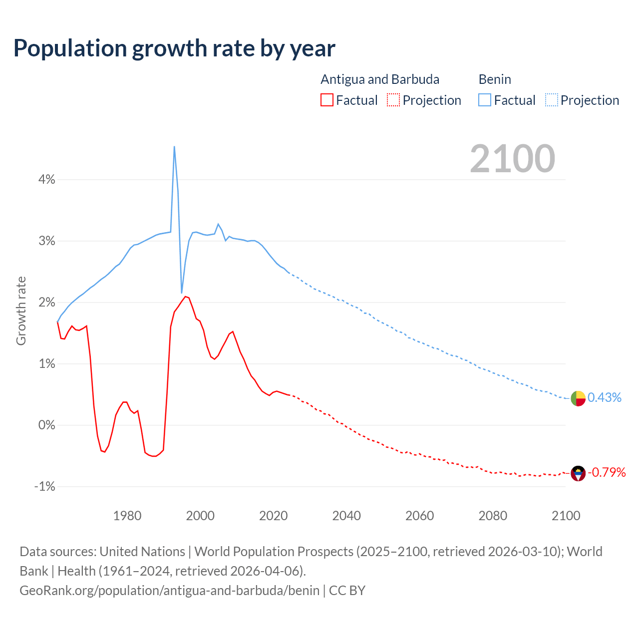 - For the last 10 years, Antigua and Barbuda has had an average growth rate of +0.57% per year vs +2.77% in Benin.