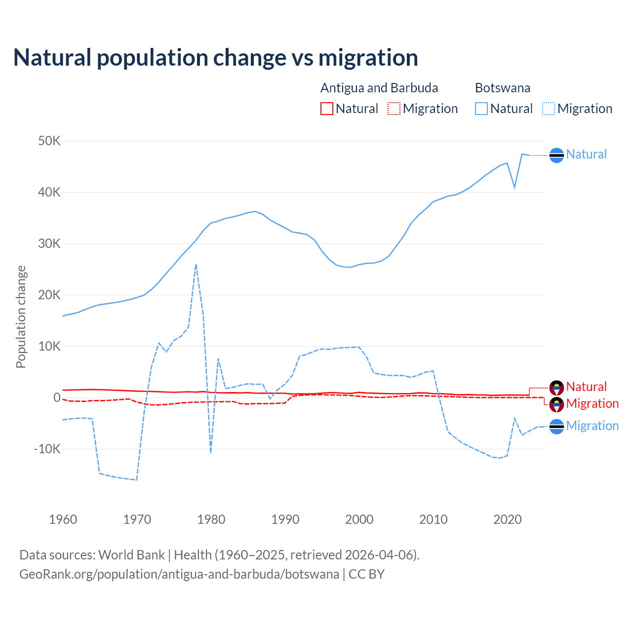 Over the last 10 years, 97.2% of the population change in Antigua and Barbuda is from natural causes (a gain of 4,971 people) and 2.76% is from migration (a gain of 141 people). In Botswana 82.5% is from natural causes (a gain of 436,373 people) and 17.5% is from migration (a loss of 92,293 people).