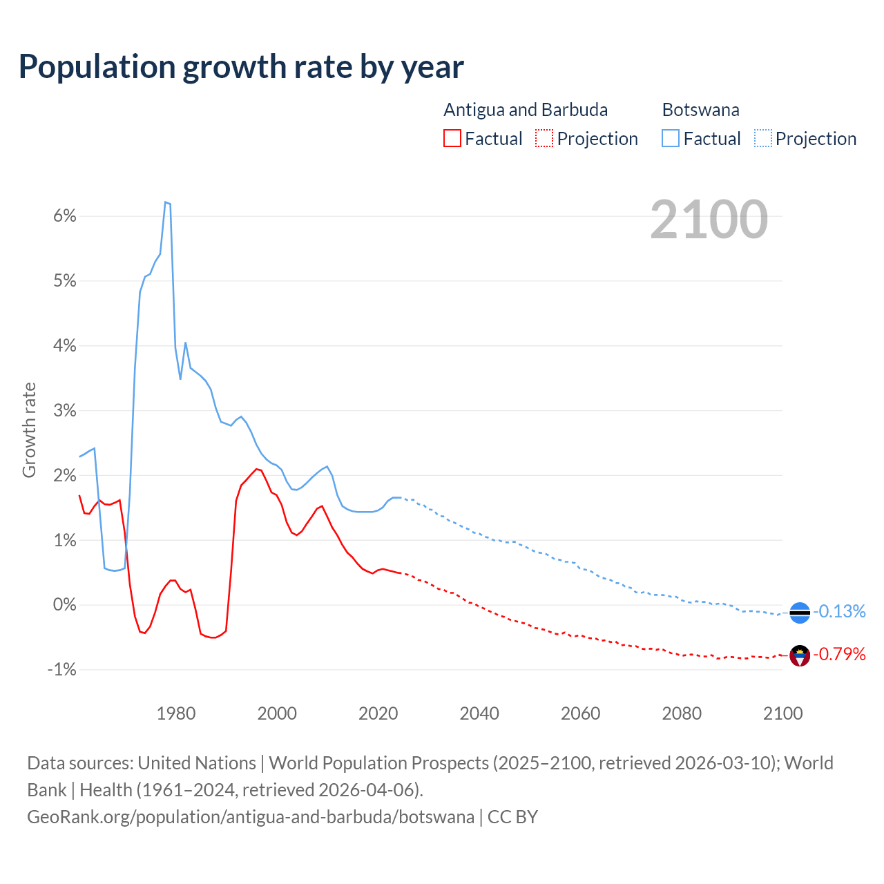 - For the last 10 years, Antigua and Barbuda has had an average growth rate of +0.57% per year vs +1.5% in Botswana.