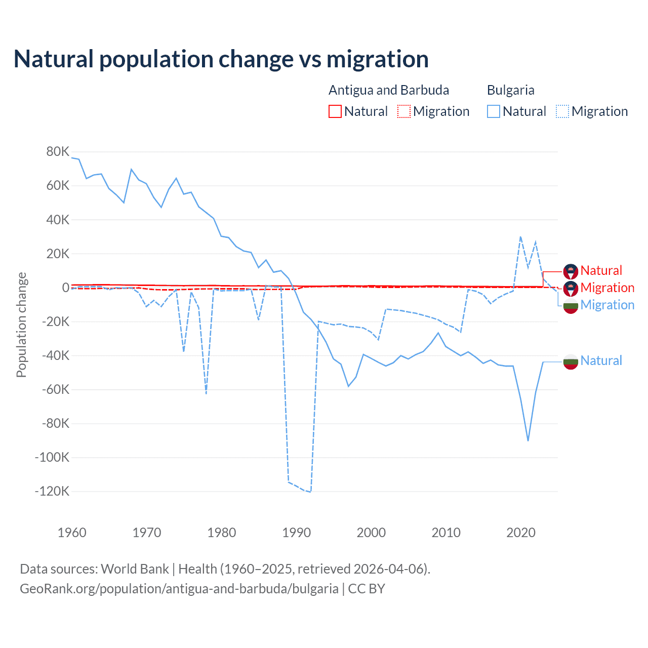 Over the last 10 years, 97.2% of the population change in Antigua and Barbuda is from natural causes (a gain of 4,971 people) and 2.76% is from migration (a gain of 141 people). In Bulgaria 92.1% is from natural causes (a loss of 528,535 people) and 7.94% is from migration (a gain of 45,567 people).