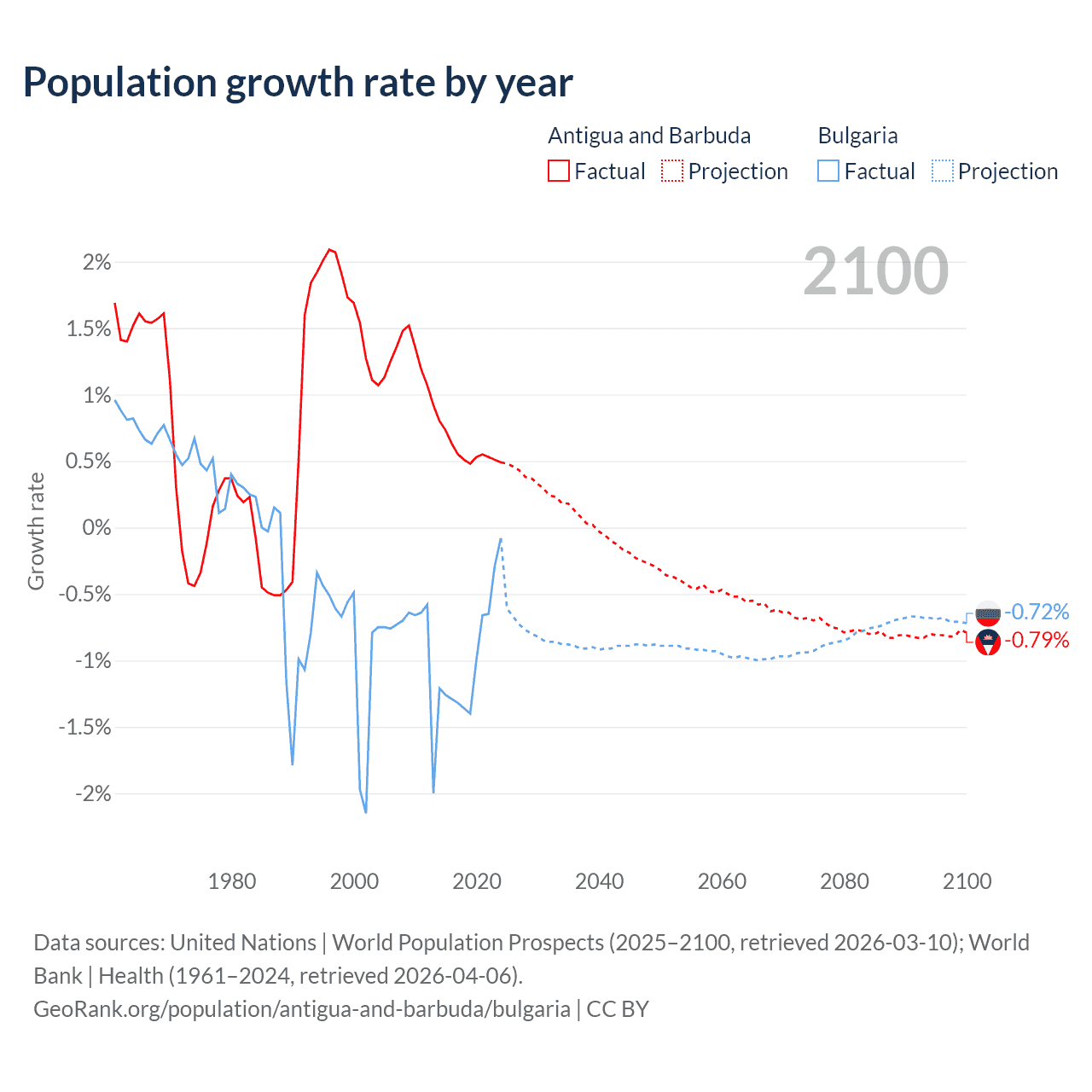 - For the last 10 years, Antigua and Barbuda has had an average growth rate of +0.57% per year vs -0.96% in Bulgaria.