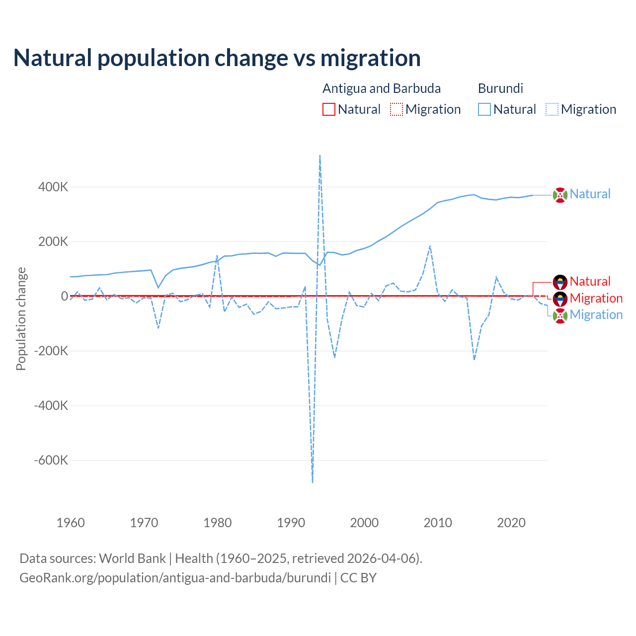 Over the last 10 years, 97.2% of the population change in Antigua and Barbuda is from natural causes (a gain of 4,971 people) and 2.76% is from migration (a gain of 141 people). In Burundi 91% is from natural causes (a gain of 3,614,502 people) and 9.03% is from migration (a loss of 358,928 people).