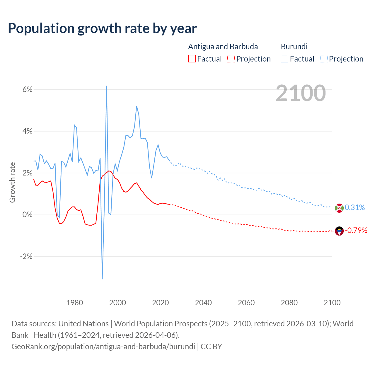 - For the last 10 years, Antigua and Barbuda has had an average growth rate of +0.57% per year vs +2.74% in Burundi.