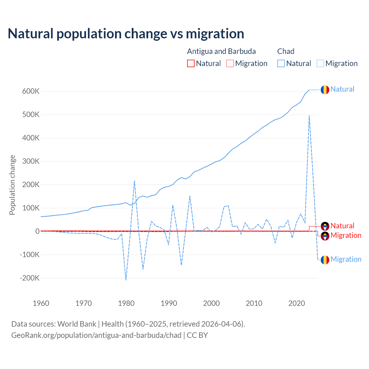 Over the last 10 years, 97.2% of the population change in Antigua and Barbuda is from natural causes (a gain of 4,971 people) and 2.76% is from migration (a gain of 141 people). In Chad 88.7% is from natural causes (a gain of 5,253,964 people) and 11.3% is from migration (a gain of 672,204 people).