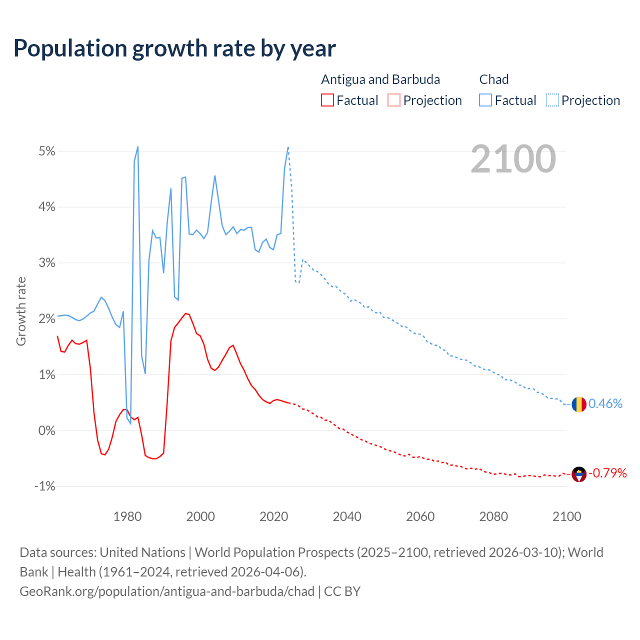 - For the last 10 years, Antigua and Barbuda has had an average growth rate of +0.57% per year vs +3.65% in Chad.