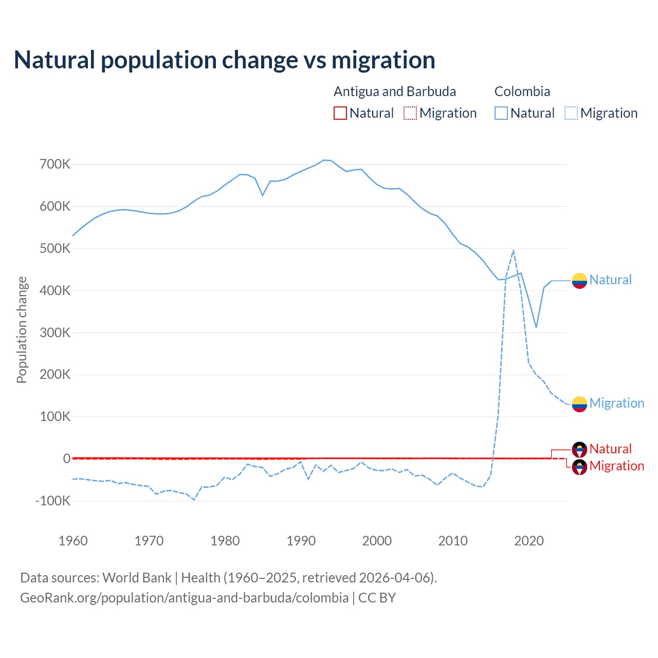 Over the last 10 years, 97.2% of the population change in Antigua and Barbuda is from natural causes (a gain of 4,971 people) and 2.76% is from migration (a gain of 141 people). In Colombia 66.6% is from natural causes (a gain of 4,162,856 people) and 33.4% is from migration (a gain of 2,083,051 people).