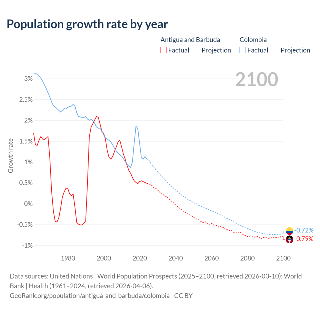 - For the last 10 years, Antigua and Barbuda has had an average growth rate of +0.57% per year vs +1.25% in Colombia.