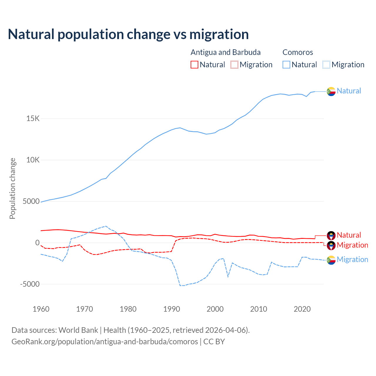 Over the last 10 years, 97.2% of the population change in Antigua and Barbuda is from natural causes (a gain of 4,971 people) and 2.76% is from migration (a gain of 141 people). In Comoros 87.9% is from natural causes (a gain of 179,319 people) and 12.1% is from migration (a loss of 24,709 people).