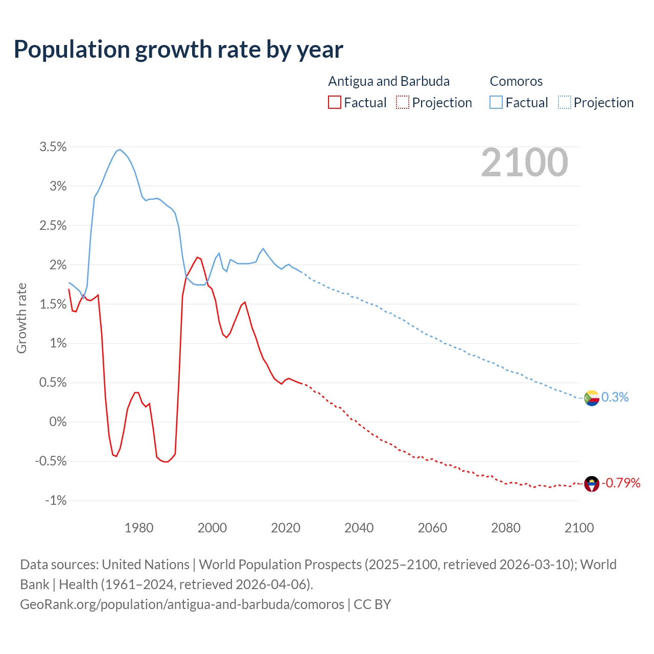 - For the last 10 years, Antigua and Barbuda has had an average growth rate of +0.57% per year vs +2.01% in Comoros.