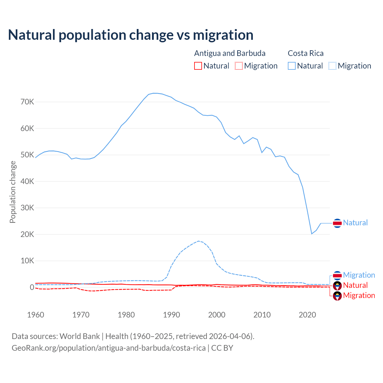 Over the last 10 years, 97.2% of the population change in Antigua and Barbuda is from natural causes (a gain of 4,971 people) and 2.76% is from migration (a gain of 141 people). In Costa Rica 96.3% is from natural causes (a gain of 362,624 people) and 3.69% is from migration (a gain of 13,900 people).