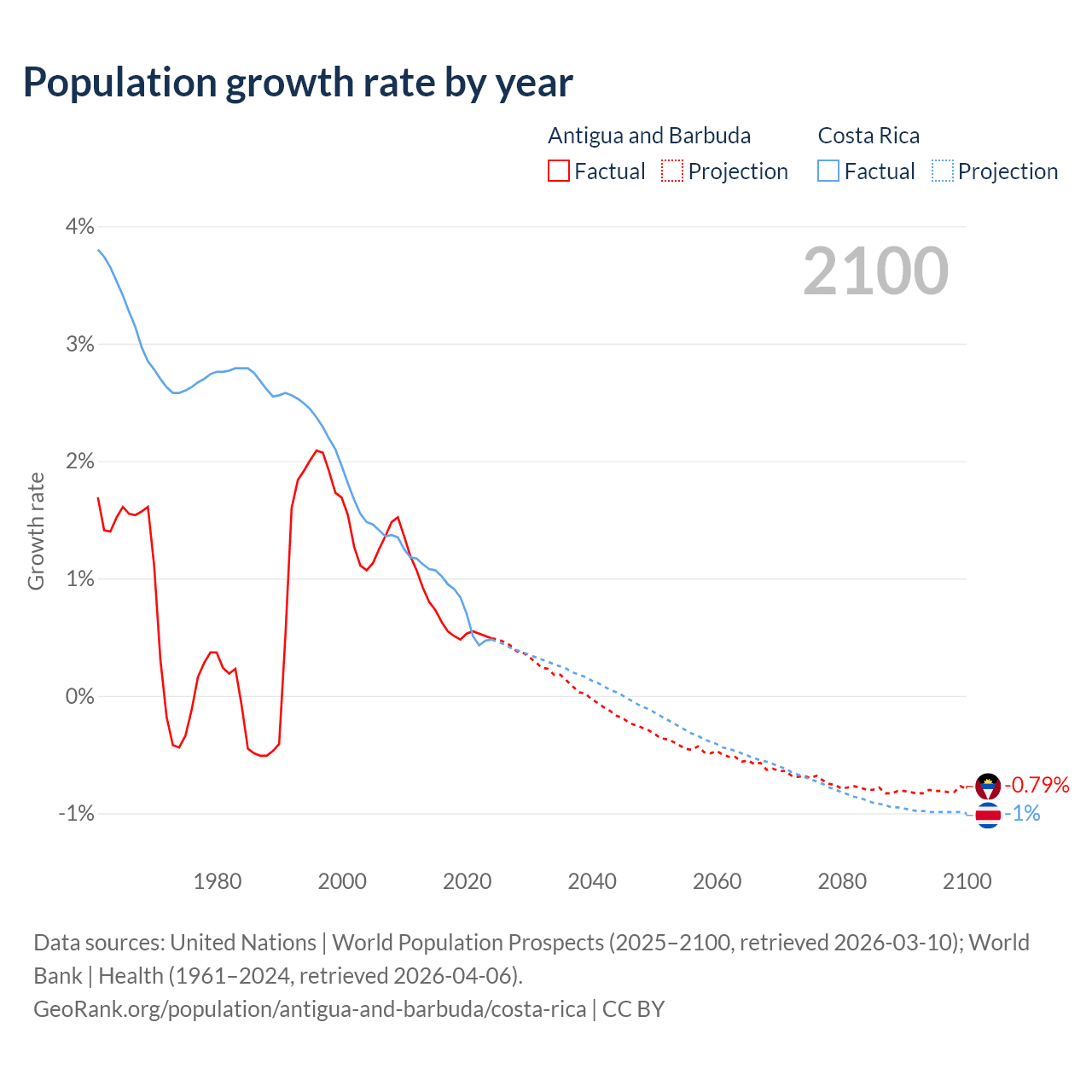 - For the last 10 years, Antigua and Barbuda has had an average growth rate of +0.57% per year vs +0.77% in Costa Rica.
