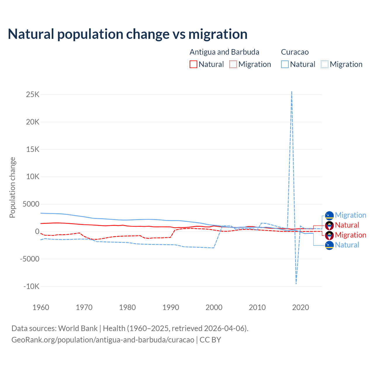 Over the last 10 years, 97.2% of the population change in Antigua and Barbuda is from natural causes (a gain of 4,971 people) and 2.76% is from migration (a gain of 141 people). In Curacao 3.72% is from natural causes (a gain of 834 people) and 96.3% is from migration (a gain of 21,615 people).