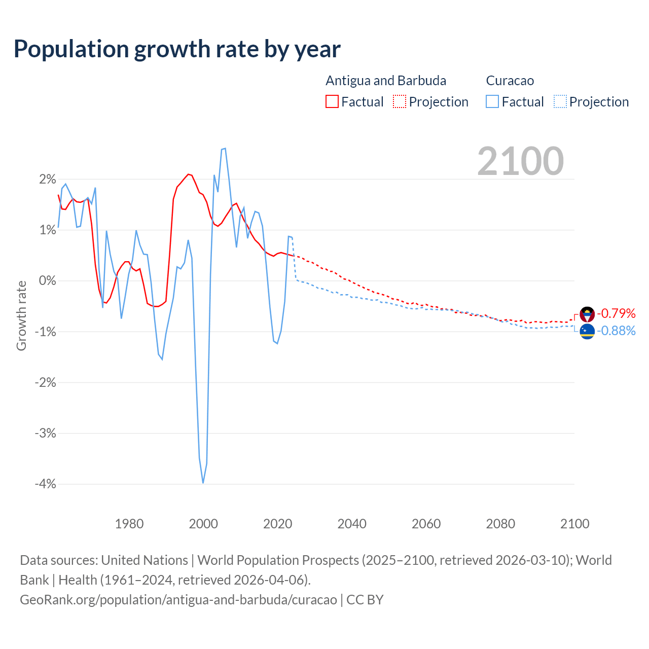 - For the last 10 years, Antigua and Barbuda has had an average growth rate of +0.57% per year vs +0.13% in Curacao.