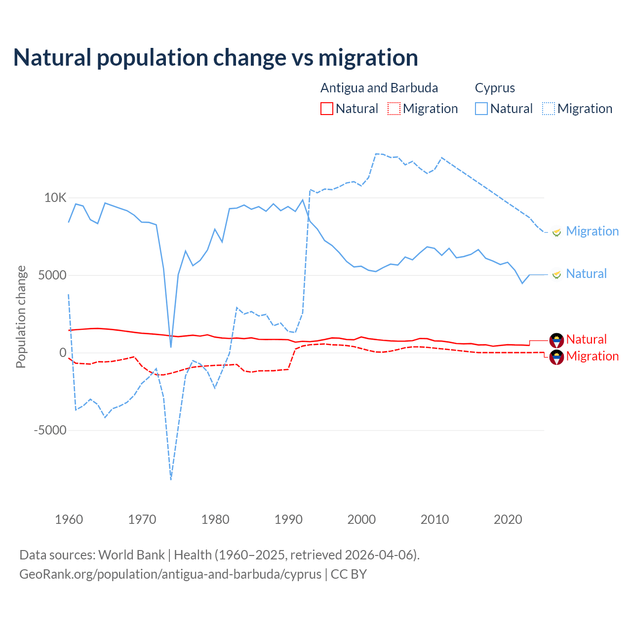 Over the last 10 years, 97.2% of the population change in Antigua and Barbuda is from natural causes (a gain of 4,971 people) and 2.76% is from migration (a gain of 141 people). In Cyprus 36.2% is from natural causes (a gain of 57,464 people) and 63.8% is from migration (a gain of 101,458 people).