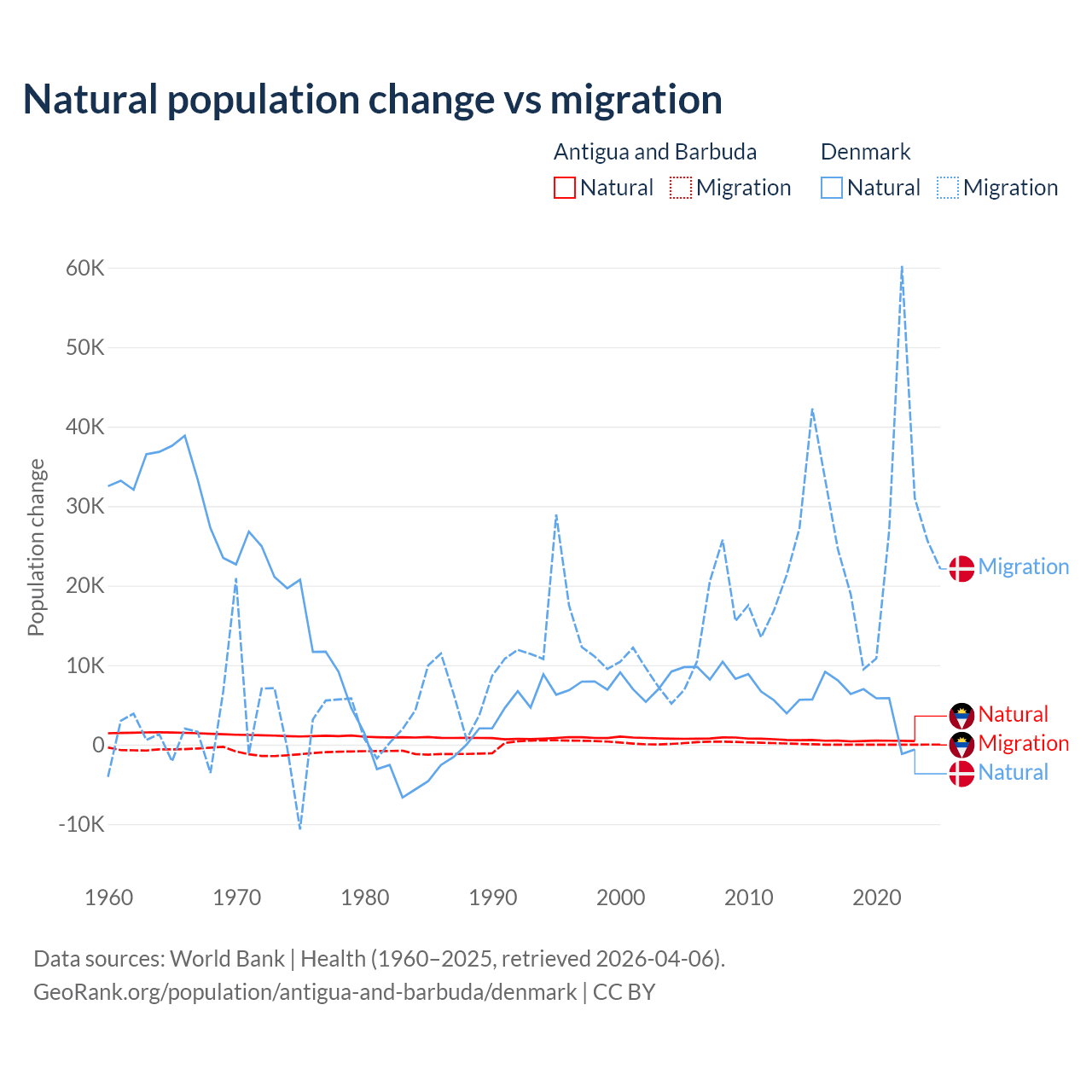 Over the last 10 years, 97.2% of the population change in Antigua and Barbuda is from natural causes (a gain of 4,971 people) and 2.76% is from migration (a gain of 141 people). In Denmark 15.4% is from natural causes (a gain of 51,826 people) and 84.6% is from migration (a gain of 284,848 people).
