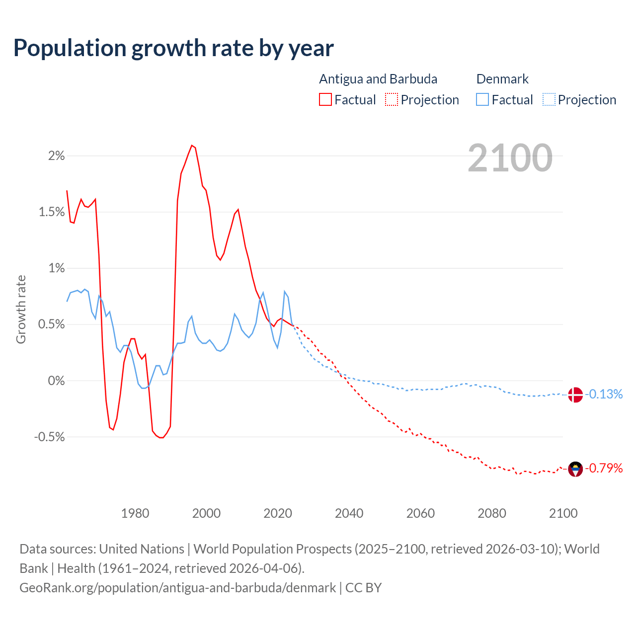 - For the last 10 years, Antigua and Barbuda has had an average growth rate of +0.57% per year vs +0.57% in Denmark.