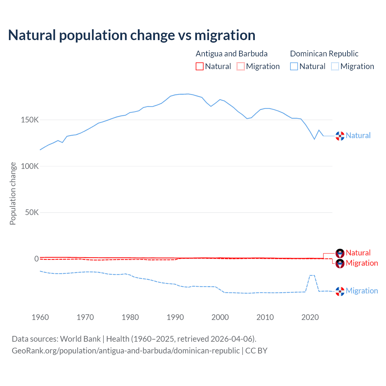 Over the last 10 years, 97.2% of the population change in Antigua and Barbuda is from natural causes (a gain of 4,971 people) and 2.76% is from migration (a gain of 141 people). In the Dominican Republic 81.8% is from natural causes (a gain of 1,447,764 people) and 18.2% is from migration (a loss of 322,919 people).