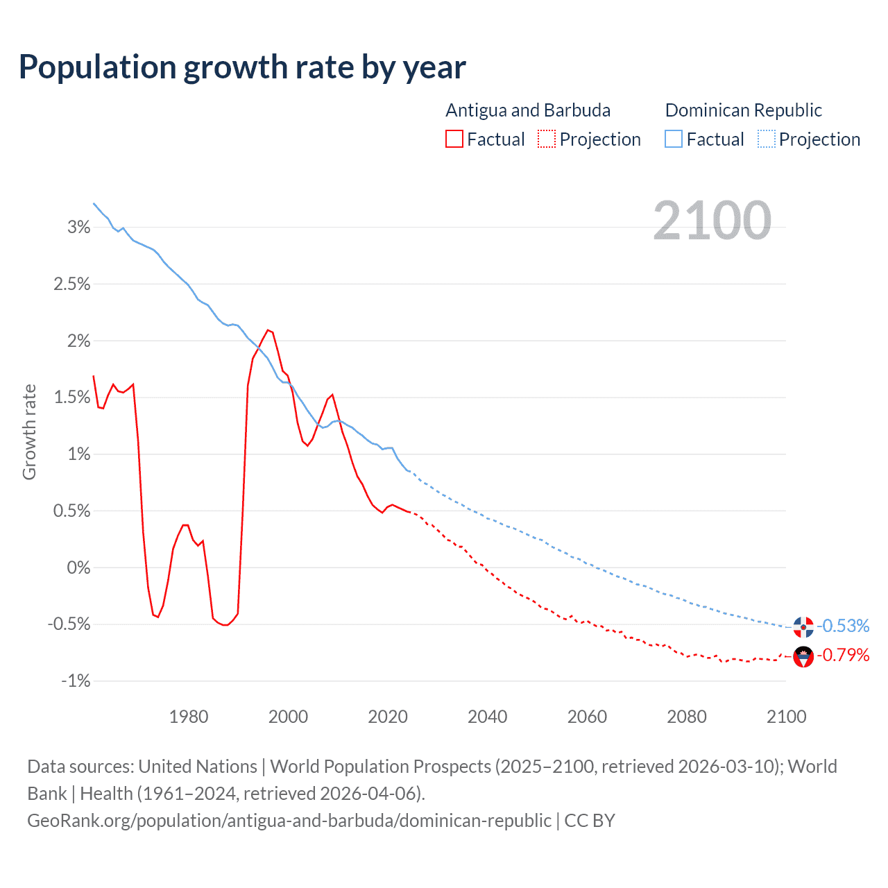 - For the last 10 years, Antigua and Barbuda has had an average growth rate of +0.57% per year vs +1.04% in the Dominican Republic.