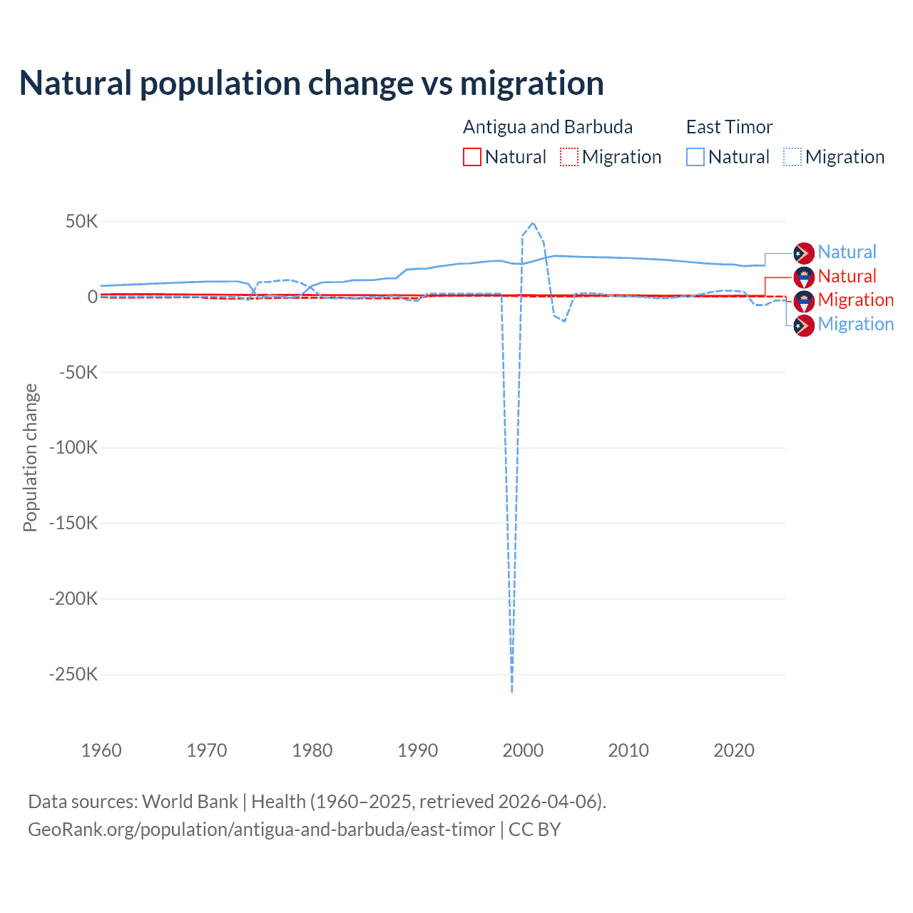 Over the last 10 years, 97.2% of the population change in Antigua and Barbuda is from natural causes (a gain of 4,971 people) and 2.76% is from migration (a gain of 141 people). In East Timor 98.3% is from natural causes (a gain of 217,698 people) and 1.66% is from migration (a gain of 3,665 people).