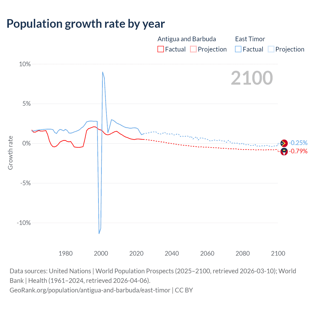 - For the last 10 years, Antigua and Barbuda has had an average growth rate of +0.57% per year vs +1.74% in East Timor.