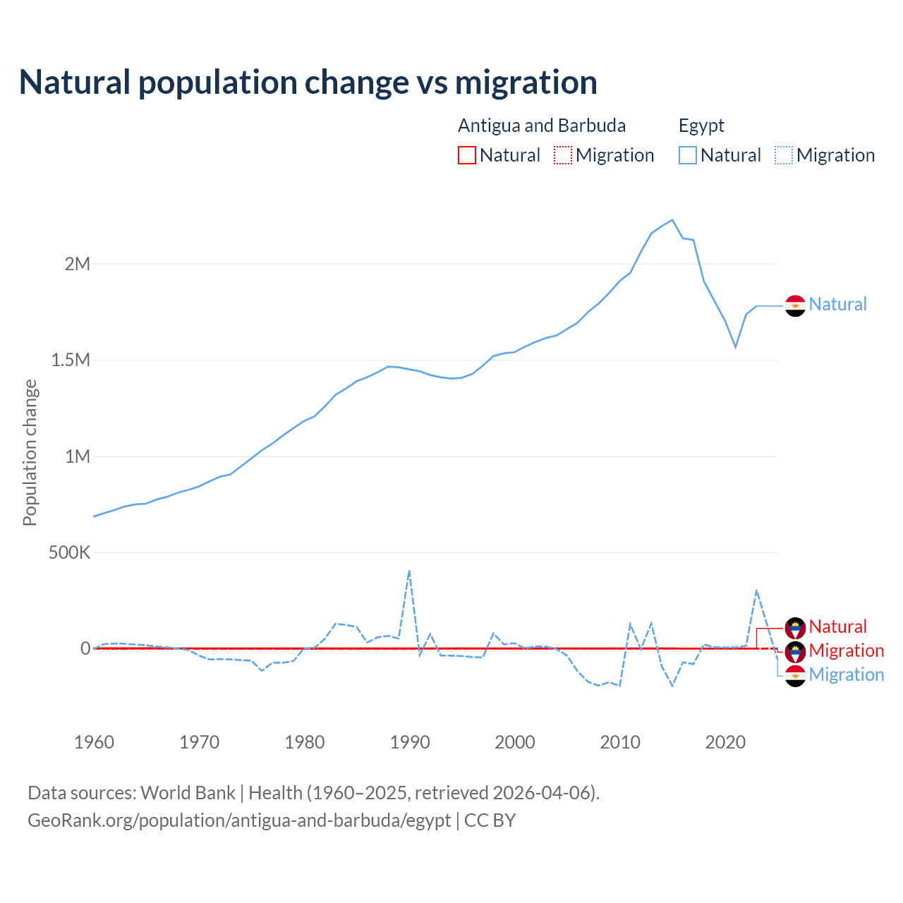 Over the last 10 years, 97.2% of the population change in Antigua and Barbuda is from natural causes (a gain of 4,971 people) and 2.76% is from migration (a gain of 141 people). In Egypt 99.6% is from natural causes (a gain of 19,180,073 people) and 0.41% is from migration (a loss of 78,975 people).
