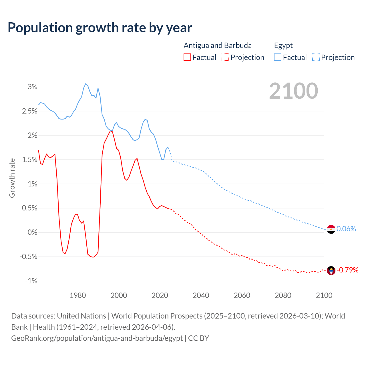- For the last 10 years, Antigua and Barbuda has had an average growth rate of +0.57% per year vs +1.84% in Egypt.