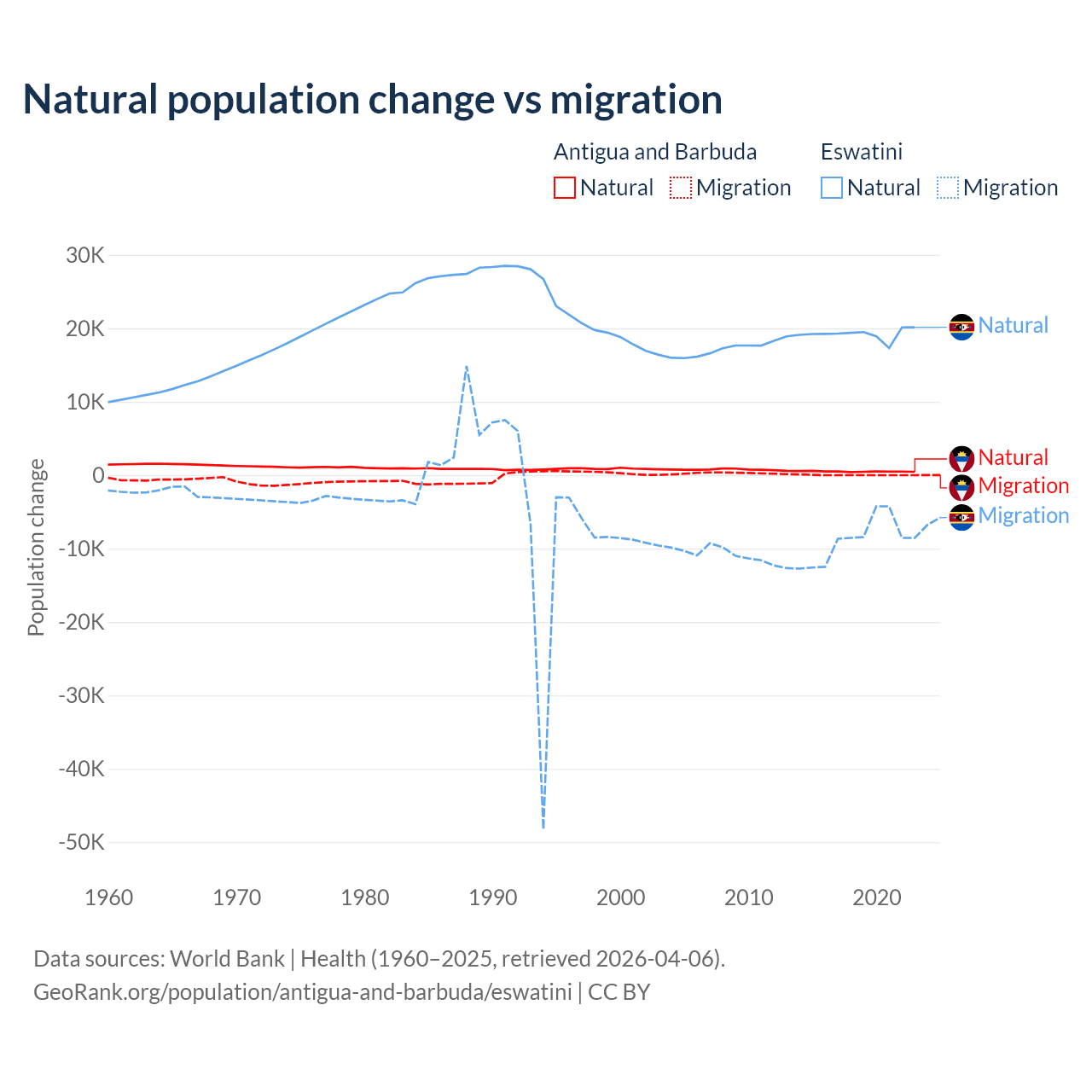 Over the last 10 years, 97.2% of the population change in Antigua and Barbuda is from natural causes (a gain of 4,971 people) and 2.76% is from migration (a gain of 141 people). In Eswatini 68.3% is from natural causes (a gain of 192,206 people) and 31.7% is from migration (a loss of 89,012 people).