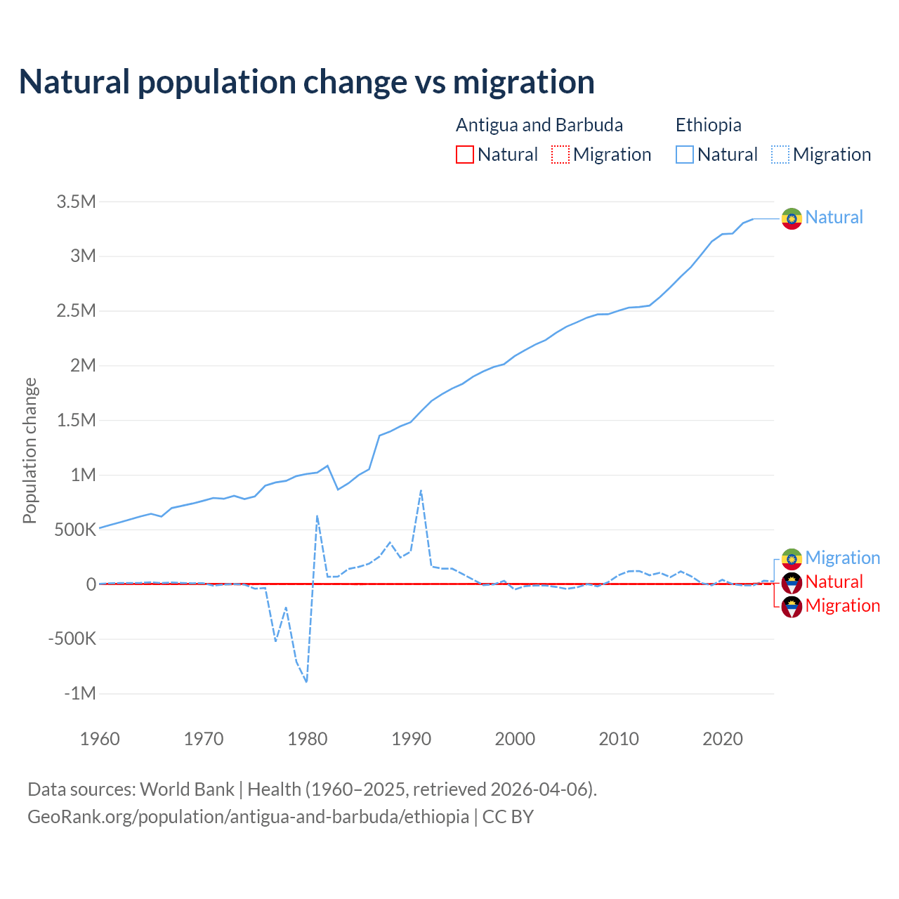Over the last 10 years, 97.2% of the population change in Antigua and Barbuda is from natural causes (a gain of 4,971 people) and 2.76% is from migration (a gain of 141 people). In Ethiopia 98.8% is from natural causes (a gain of 30,237,373 people) and 1.19% is from migration (a gain of 365,488 people).
