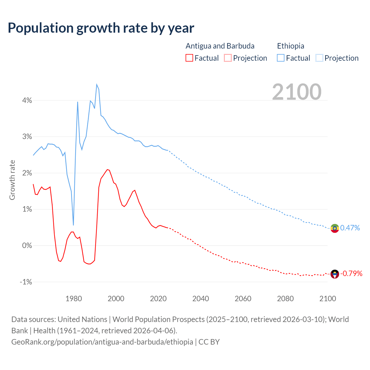 - For the last 10 years, Antigua and Barbuda has had an average growth rate of +0.57% per year vs +2.71% in Ethiopia.
