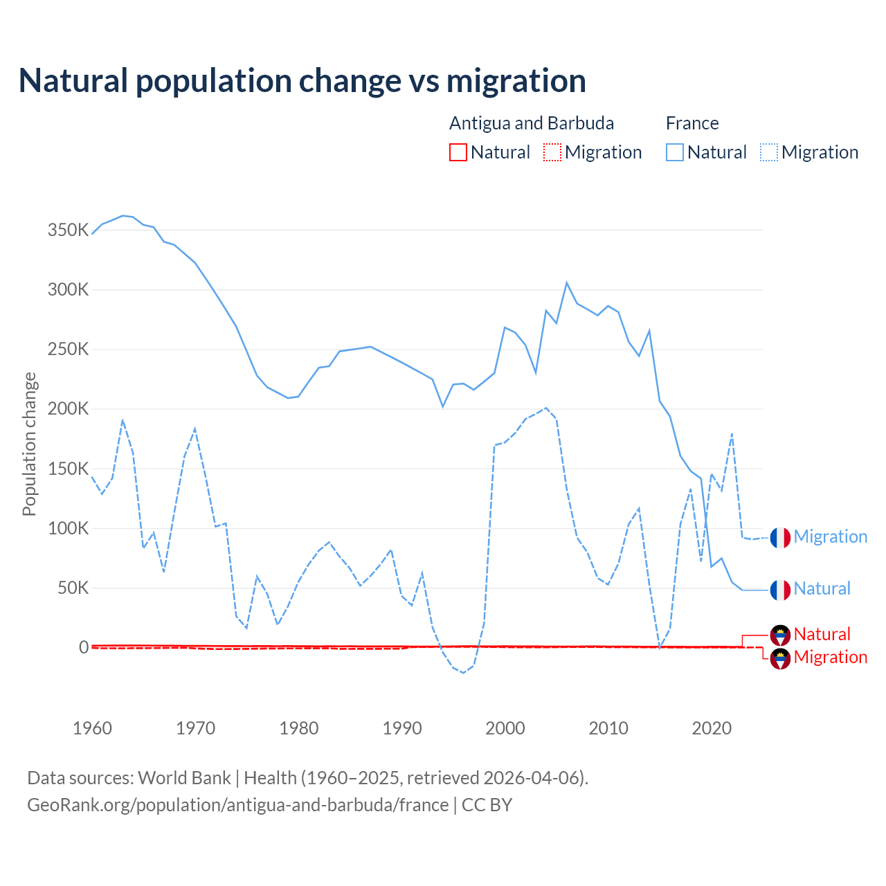 Over the last 10 years, 97.2% of the population change in Antigua and Barbuda is from natural causes (a gain of 4,971 people) and 2.76% is from migration (a gain of 141 people). In France 59.5% is from natural causes (a gain of 1,359,540 people) and 40.5% is from migration (a gain of 923,723 people).