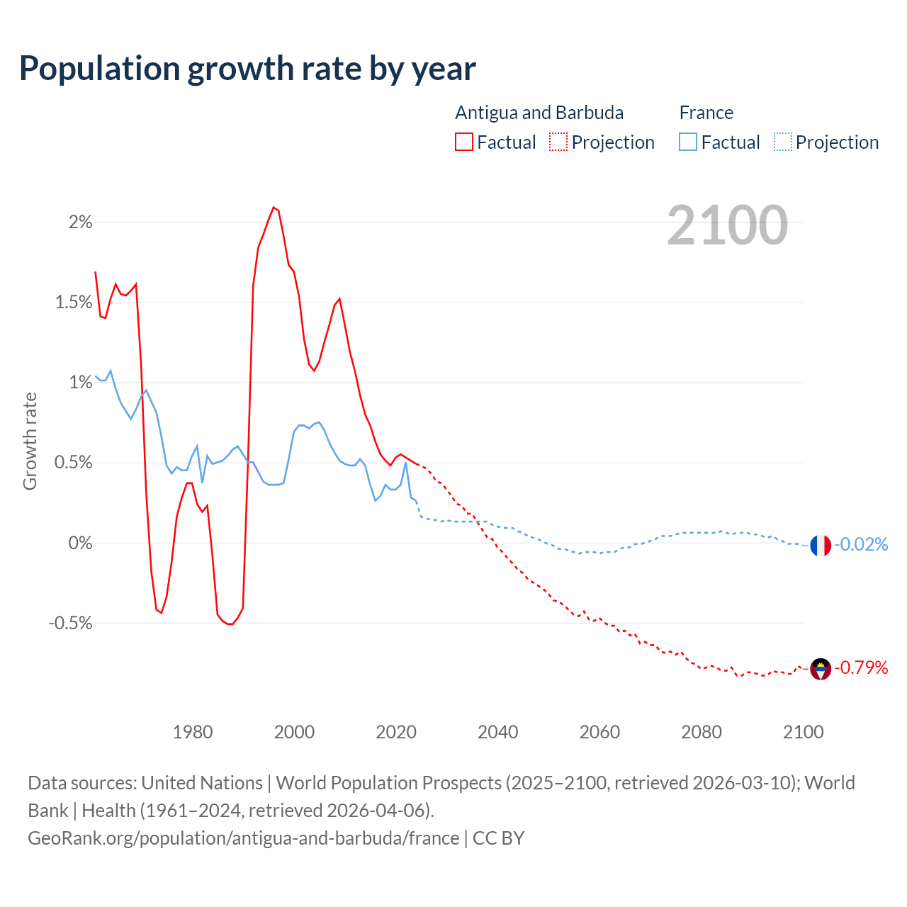 - For the last 10 years, Antigua and Barbuda has had an average growth rate of +0.57% per year vs +0.35% in France.