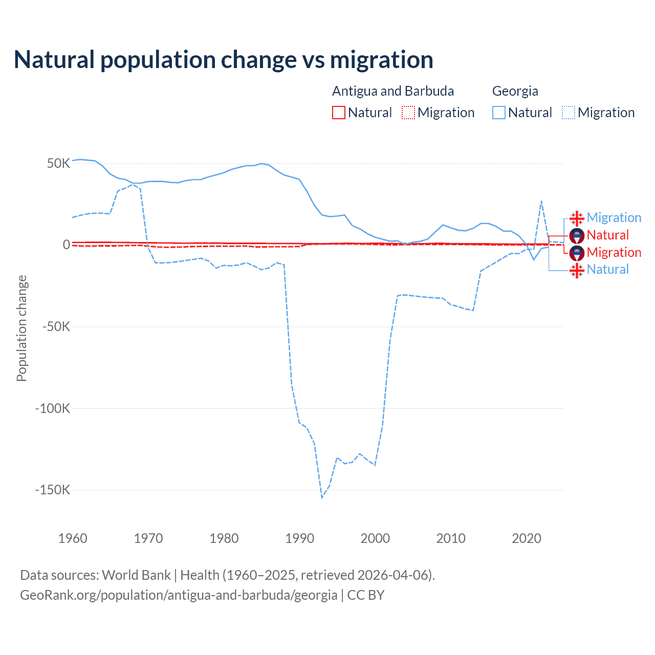 Over the last 10 years, 97.2% of the population change in Antigua and Barbuda is from natural causes (a gain of 4,971 people) and 2.76% is from migration (a gain of 141 people). In Georgia 57.7% is from natural causes (a gain of 47,646 people) and 42.3% is from migration (a loss of 34,907 people).