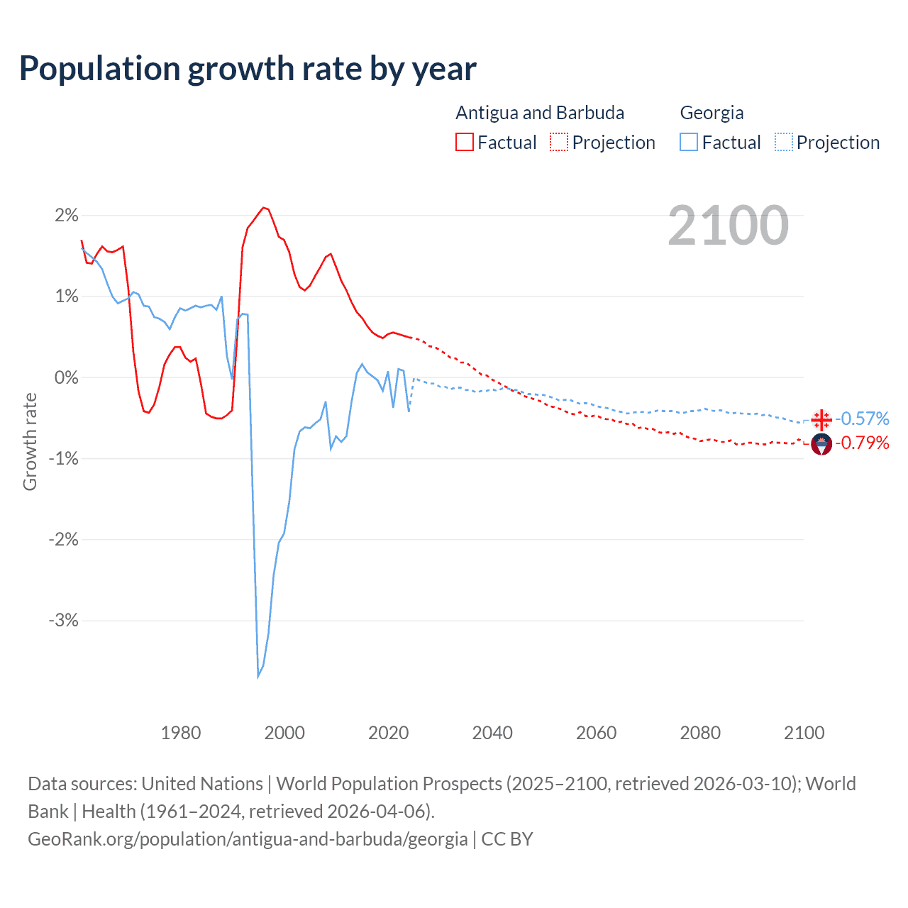 - For the last 10 years, Antigua and Barbuda has had an average growth rate of +0.57% per year vs -0.04% in Georgia.