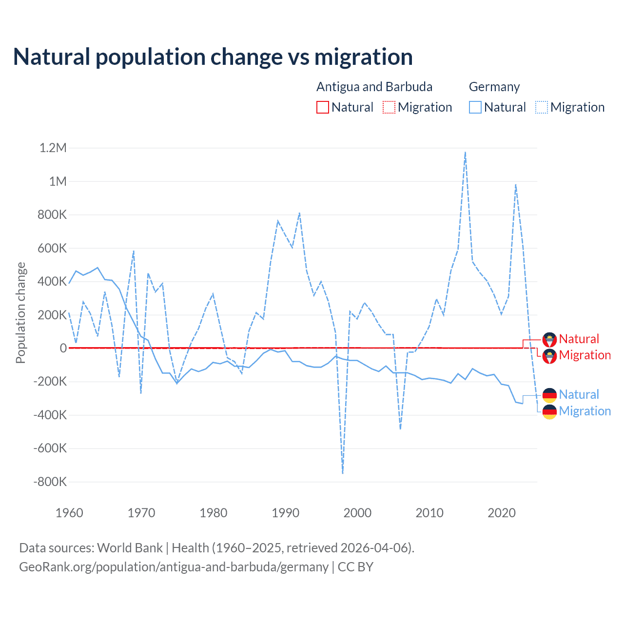 Over the last 10 years, 97.2% of the population change in Antigua and Barbuda is from natural causes (a gain of 4,971 people) and 2.76% is from migration (a gain of 141 people). In Germany 26.8% is from natural causes (a loss of 2,036,130 people) and 73.2% is from migration (a gain of 5,565,916 people).