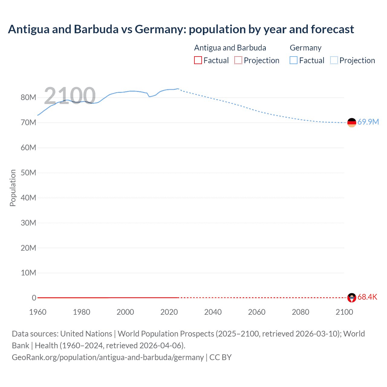 The latest officially reported population of Antigua and Barbuda was 93,772 in 2024 vs 83,516,593 people in Germany in 2024. In 2026, based on the adjusted UN estimation, the current Antigua and Barbuda's population is 94,757 people compared to 82,575,542 in Germany.