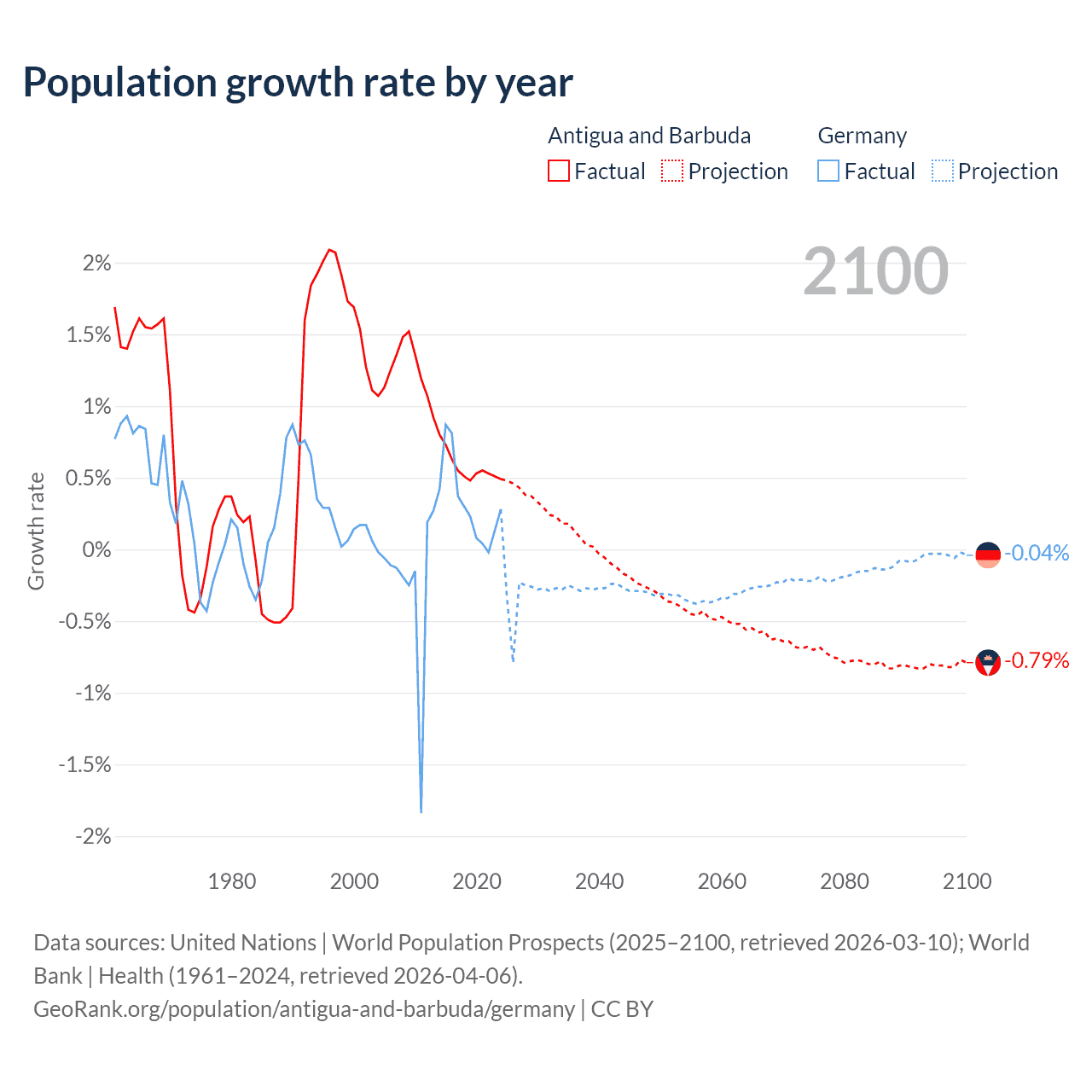- For the last 10 years, Antigua and Barbuda has had an average growth rate of +0.57% per year vs +0.32% in Germany.