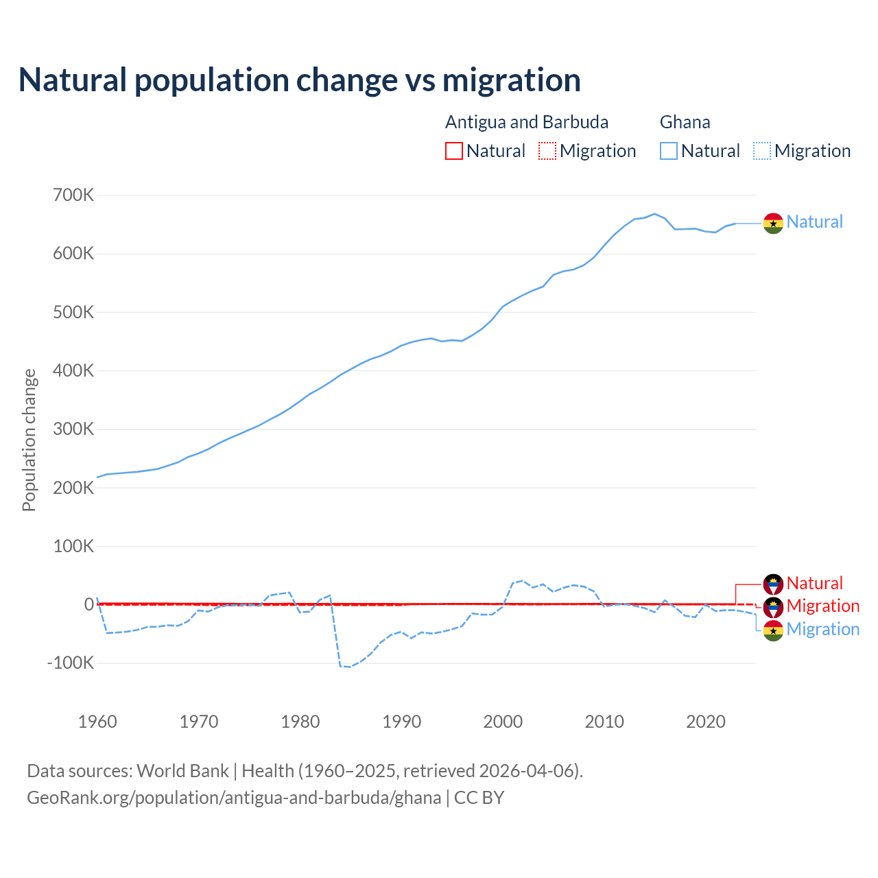 Over the last 10 years, 97.2% of the population change in Antigua and Barbuda is from natural causes (a gain of 4,971 people) and 2.76% is from migration (a gain of 141 people). In Ghana 98.6% is from natural causes (a gain of 6,484,449 people) and 1.37% is from migration (a loss of 90,310 people).
