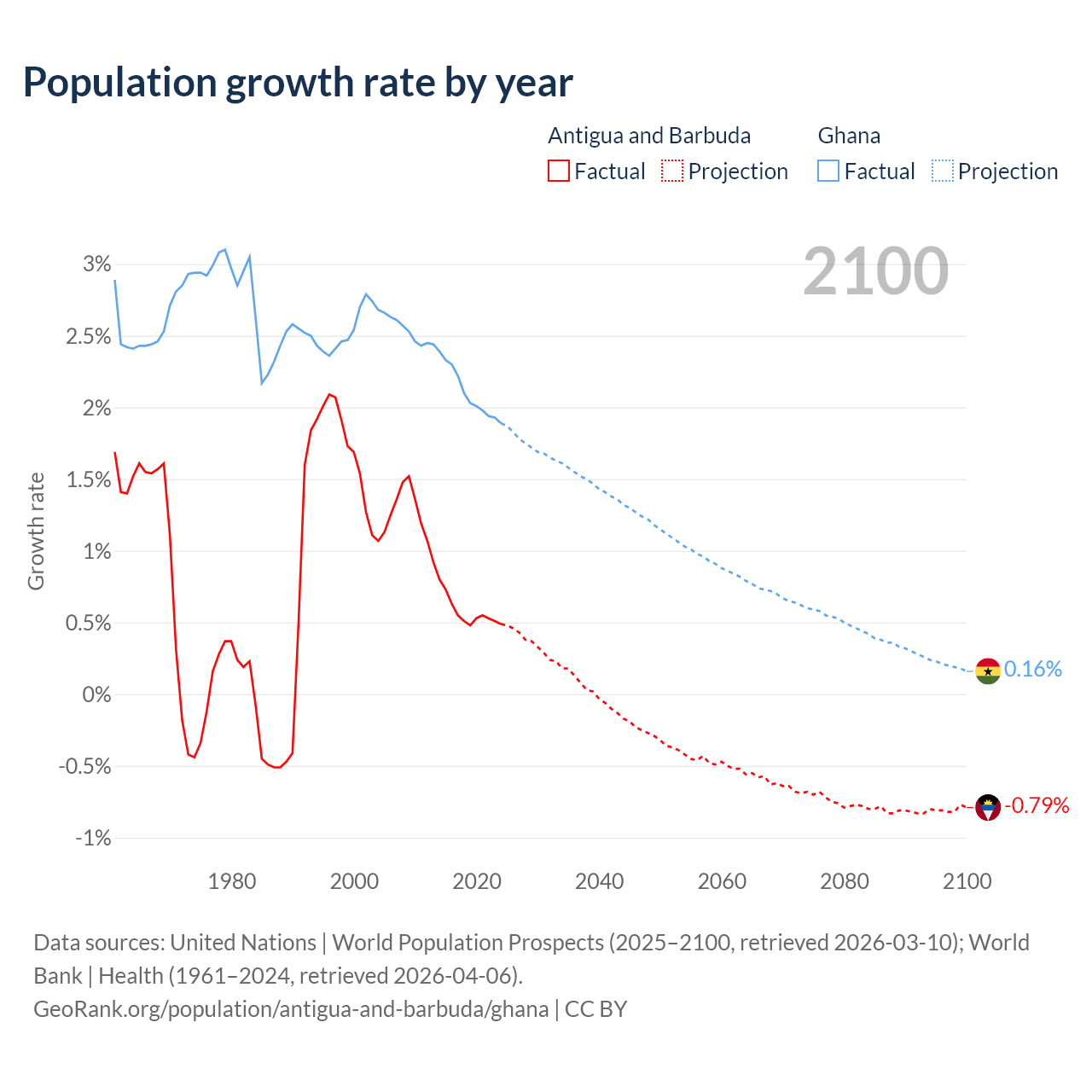 - For the last 10 years, Antigua and Barbuda has had an average growth rate of +0.57% per year vs +2.1% in Ghana.