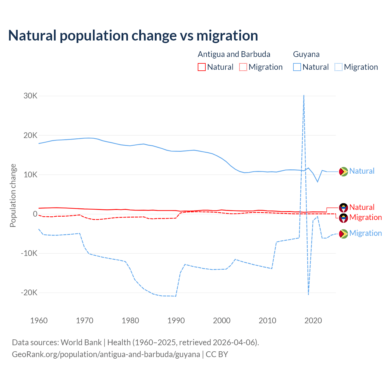 Over the last 10 years, 97.2% of the population change in Antigua and Barbuda is from natural causes (a gain of 4,971 people) and 2.76% is from migration (a gain of 141 people). In Guyana 77.7% is from natural causes (a gain of 107,419 people) and 22.3% is from migration (a loss of 30,797 people).